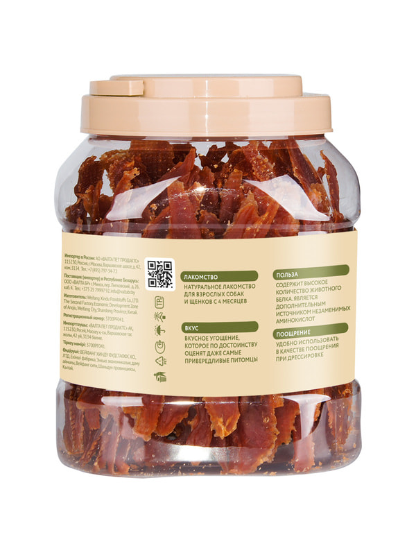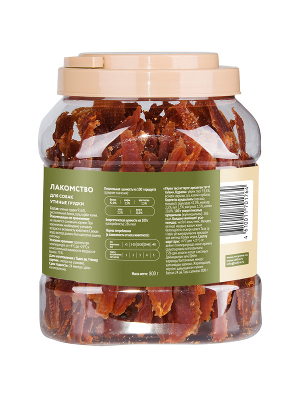 Ингредиенты: Утка 93,6%, растительный белок 6%, соль, сорбат калия.