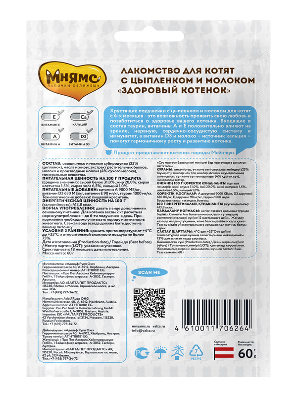 Повседневные Мнямс Лакомство Мнямс Хрустящие подушечки для котят с цыпленком и молоком "Здоровый котенок" 60 г