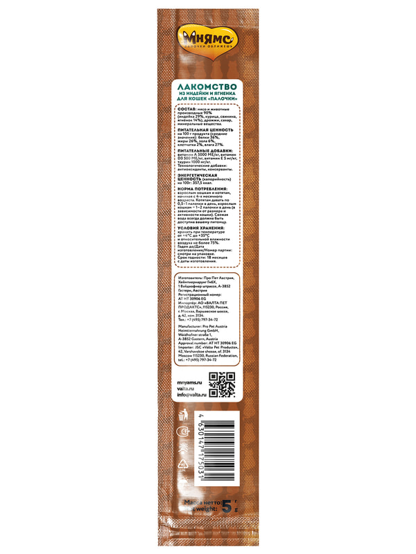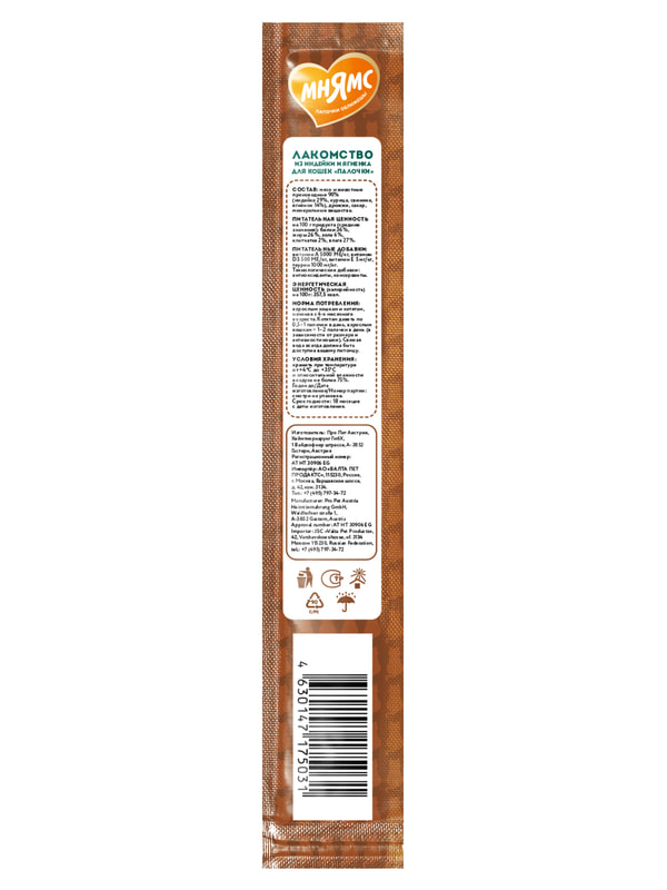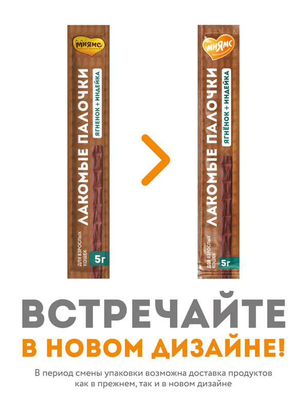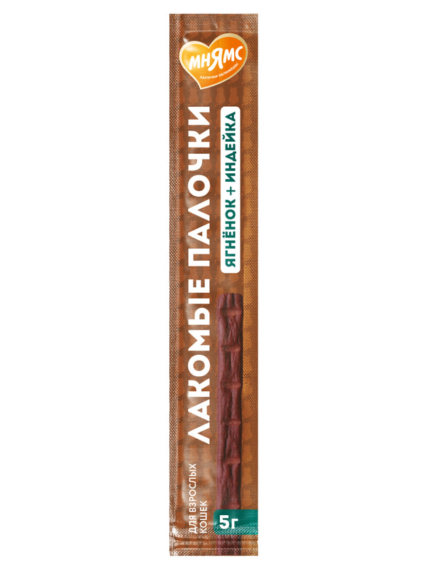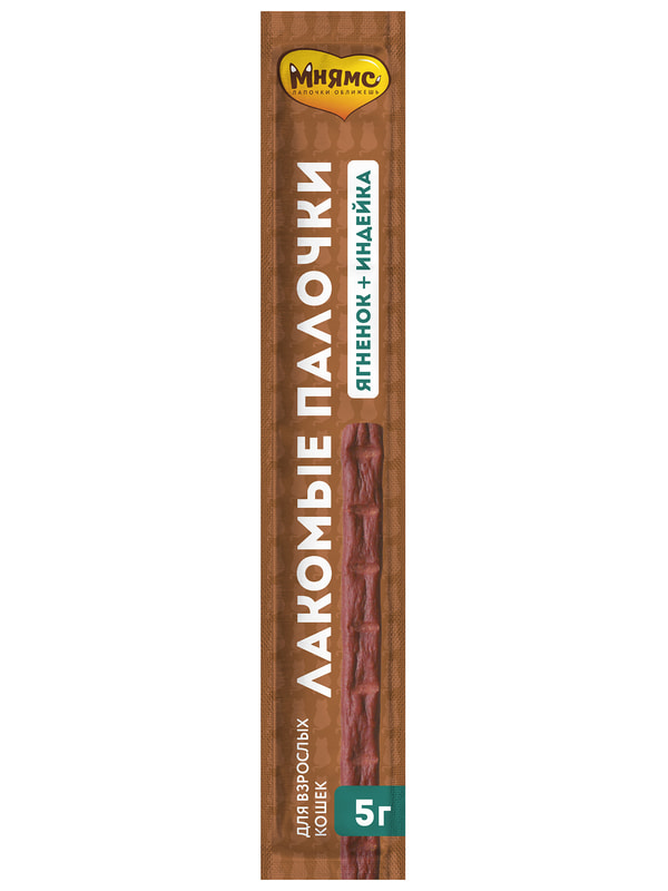 Лакомые палочки из индейки и ягненка - вкусный путь к сердцу вашей кошки. Лакомые палочки можно давать из рук, ломать и использовать для дрессировки, наполнять ими интерактивные игрушки или подмешивать в корм для улучшения вкусовой привлекательности. В составе палочек более 90% мяса. А также в составе нет злаков, глютена и ароматизаторов. Докажите свою любовь вместе с вкусными и полезными лакомыми палочками "Мнямс".