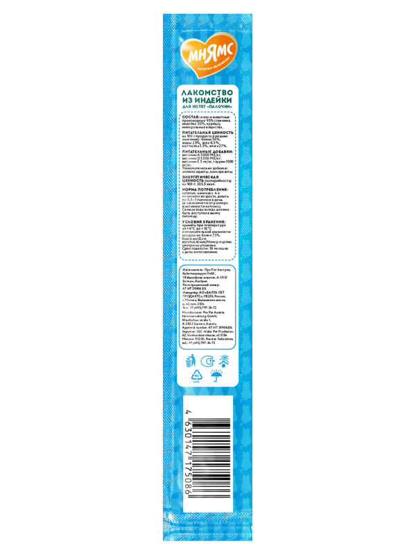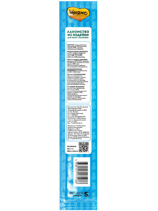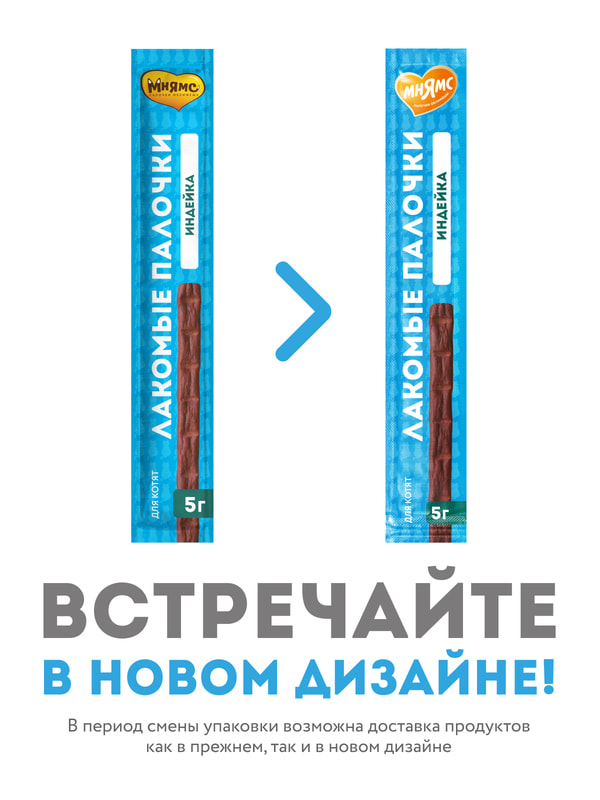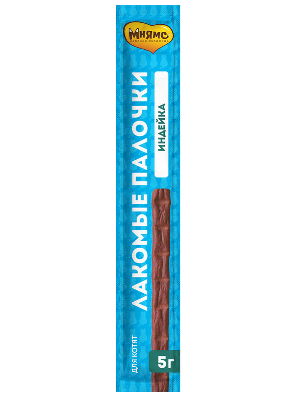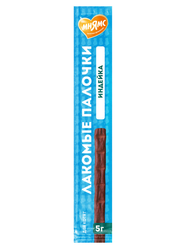 Лакомые палочки из индейки - вкусный путь к сердцу вашего котенка. Лакомые палочки можно давать из рук, ломать и использовать для дрессировки, наполнять ими интерактивные игрушки или подмешивать в корм для улучшения вкусовой привлекательности. В составе палочек более 90% мяса. А также в составе нет злаков, глютена и ароматизаторов. Докажите свою любовь вместе с вкусными и полезными лакомыми палочками "Мнямс".
