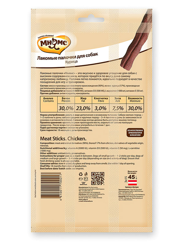 Лакомые палочки «Мнямс»- это вкусное и здоровое угощение для собак с большим содержанием мяса, которое придется по вкусу даже самому капризному любимцу.