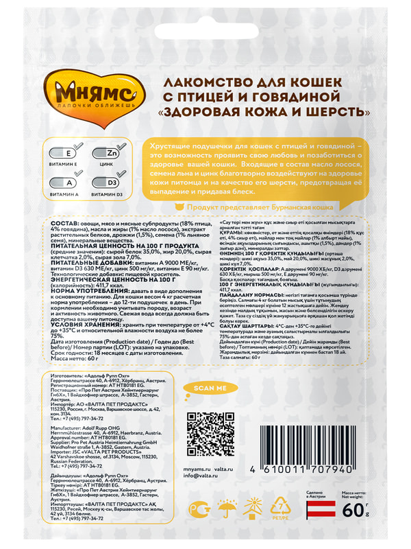Функциональные Мнямс Лакомство Мнямс "Здоровая кожа и шерсть" хрустящие подушечки для кошек с птицей и говядиной 60 г