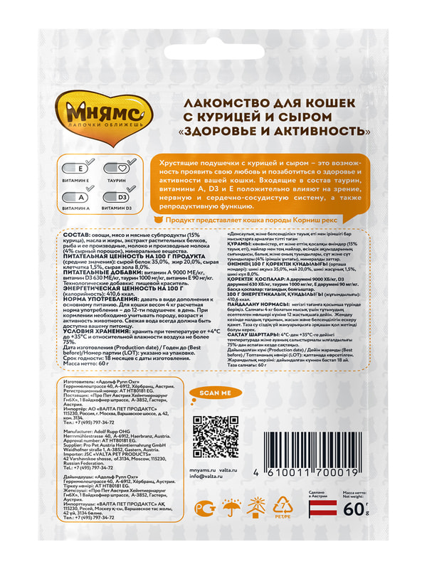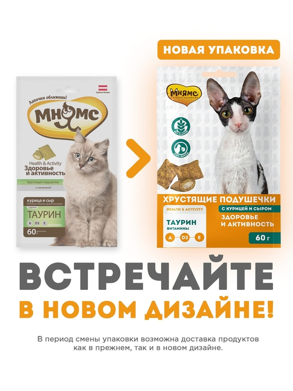 Функциональные Мнямс Лакомство Мнямс "Здоровье и активность" хрустящие подушечки для кошек с курицей и сыром 60 г