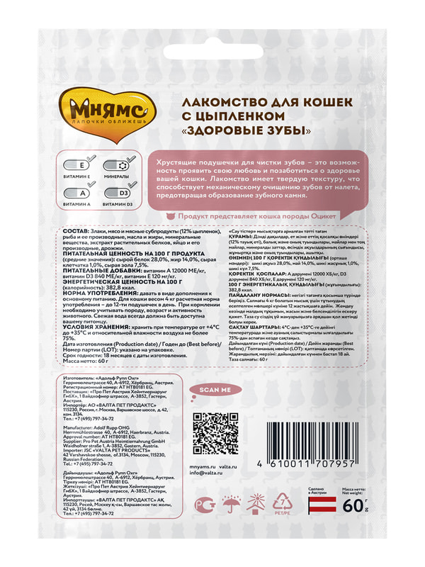 Функциональные Мнямс Лакомство Мнямс "Здоровые зубы" хрустящие подушечки для кошек с цыпленком 60 г