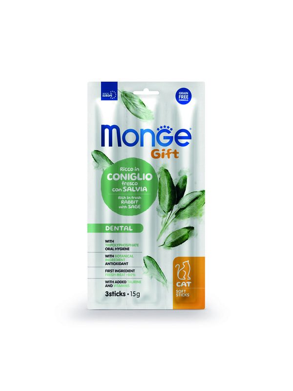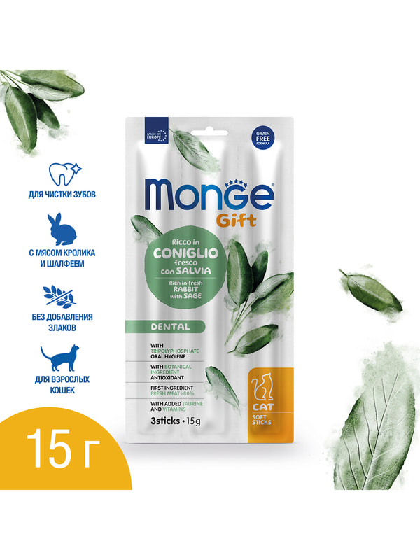 Повседневные Monge Лакомство Monge Gift Dental для кошек "Мягкие палочки" со свежим мясом кролика и шалфеем для чистки зубов 15 г
