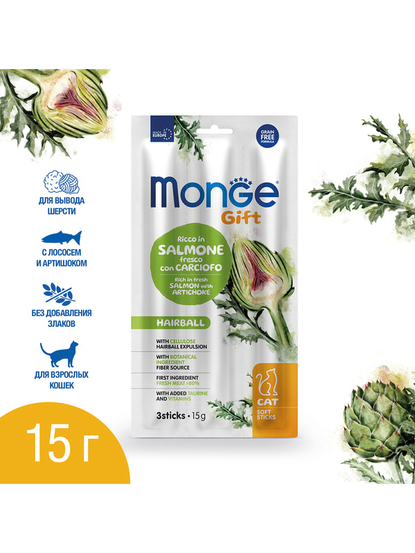 Повседневные Monge Лакомство Monge Gift Hairball для кошек "Мягкие палочки" с лососем и артишоком для вывода шерсти 15 г