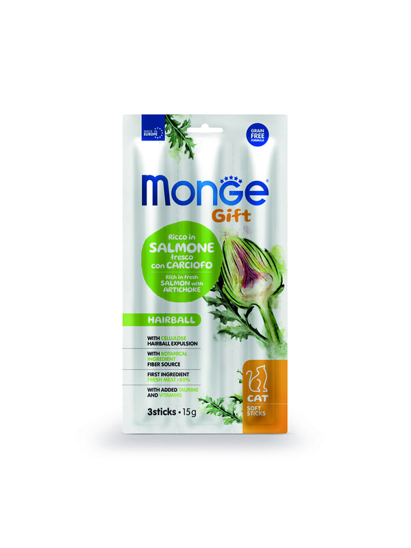 Лакомство MONGE GIFT HAIRBALL для кошек "Мягкие палочки" с лососем и артишоком для вывода шерсти 15 г.