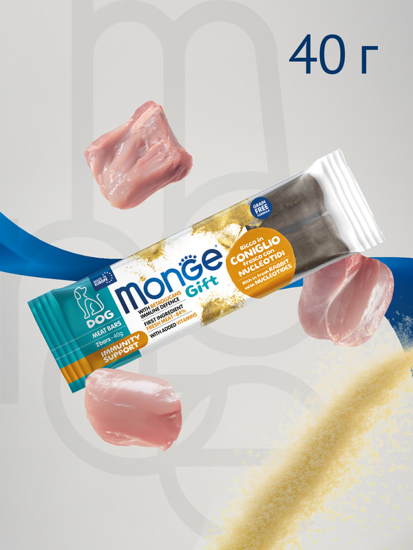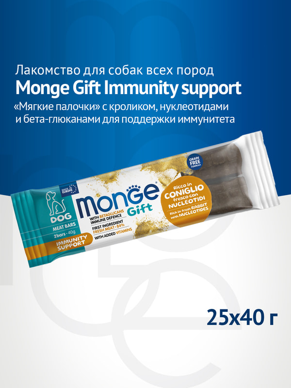 Повседневные Monge Лакомство Monge Gift Immunity support для собак всех пород "Мясные батончики" с кроликом, нуклеотидами и бета-глюканами для поддержки иммунитета 40 г