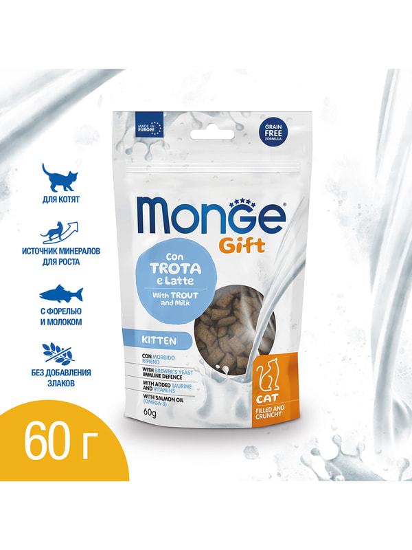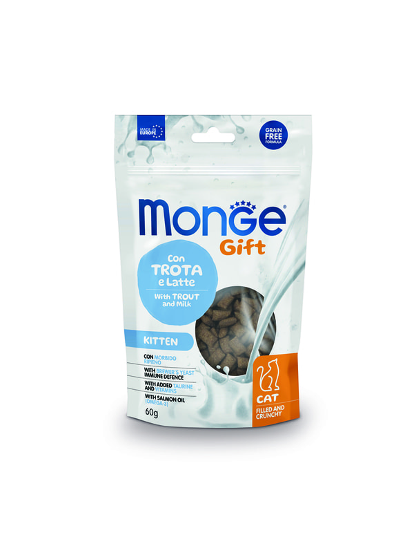 Лакомство MONGE GIFT KITTEN для котят "Хрустящие подушечки с начинкой" с форелью и молоком 60 г.