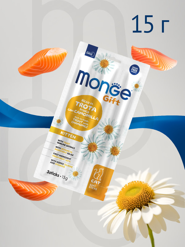 Лакомство Monge (Монж) Gift Kitten для котят "Мягкие палочки" со свежей форелью и ромашкой 15 г. Дополнительное питание для растущих котят.Разработано специально для поддержания здоровья вашего котенка!
