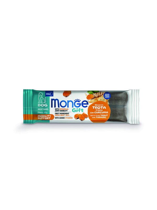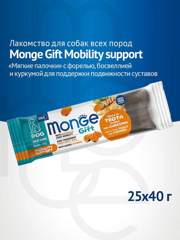 Повседневные Monge Лакомство Monge Gift Mobility support для собак всех пород "Мясные батончики" с форелью, босвеллией и куркумой для поддержки подвижности суставов 40 г