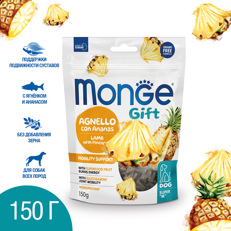 Повседневные Monge Лакомство Monge Gift Mobility support для собак всех пород "Тренировочные лакомства" с ягнёнком и ананасом для поддержки подвижности суставов 150 г