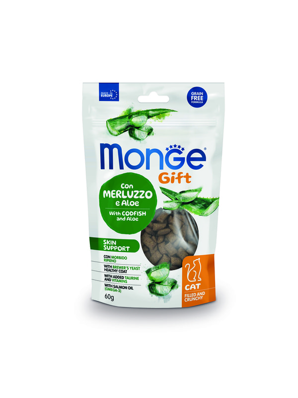 Лакомство MONGE GIFT SKIN SUPPORT для кошек "Хрустящие подушечки с начинкой" с треской и алоэ вера для здоровой кожи 60 г.