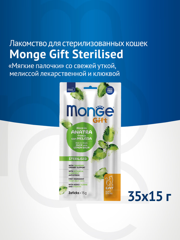 Повседневные Monge Лакомство Monge Gift Sterilised для стерилизованных кошек "Мягкие палочки" со свежей уткой, мелиссой лекарственной и клюквой 15 г