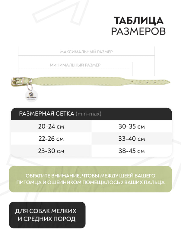 Ошейники, шлейки, намордники Mr.Kranch Ошейник Mr.Kranch для собак из натуральной кожи с QR-адресником, 22-26см, нежно-зеленый