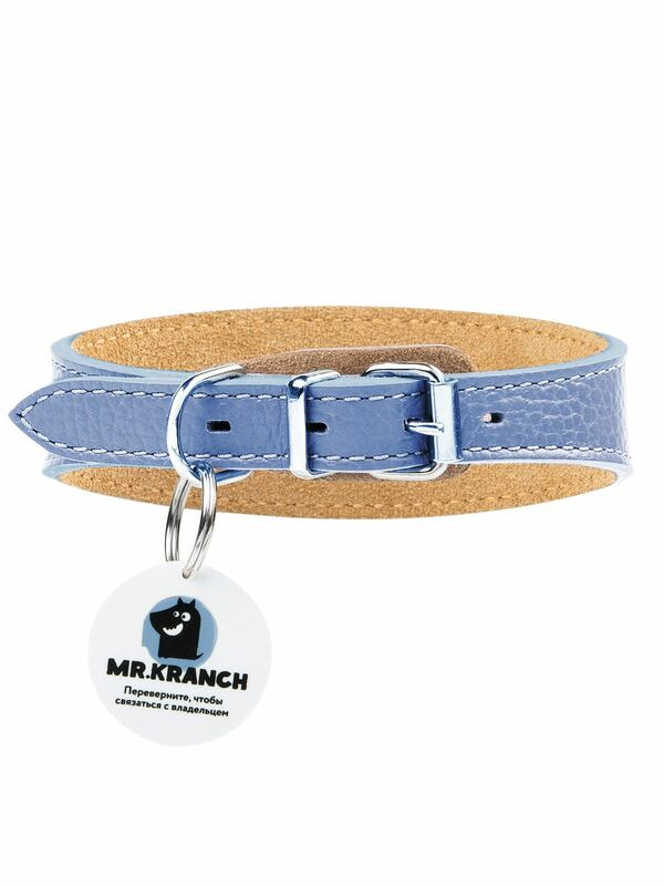 Ошейники, шлейки, намордники Mr.Kranch Ошейник-селедка Mr.Kranch для собак из натуральной кожи с QR-адресником, 19-23см, васильковый