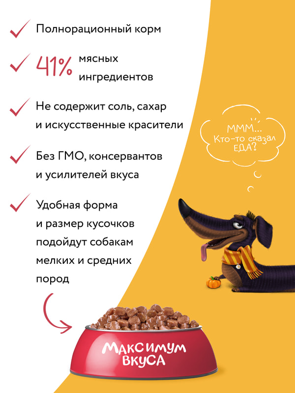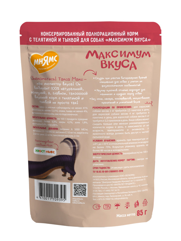 Состав: мясо и мясные субпродукты не менее 41% (телятина не менее 12,5%), злаки, тыква не менее 4%, витамины и минералы, масло подсолнечное.