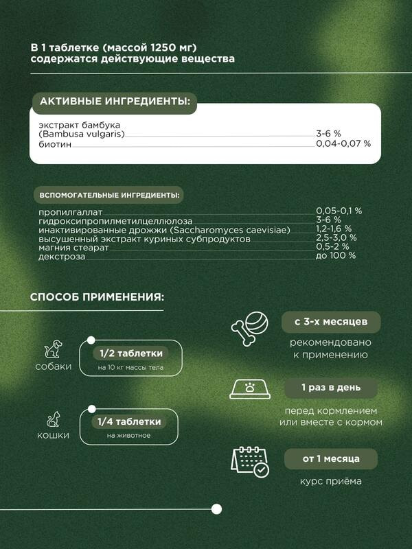 Действия добавки обусловлены входящими в ее состав компонентами, которые оказывают благоприятное действие на кожу и шерсть животных. Кремний из экстракта бамбука способствует синтезу коллагена, нормализует гидратацию кожи и ускоряет обновление клеток. Биотин контролирует кератинизацию и дифференцировку клеток эпидермиса, способствует выработке кератина, который необходим для поддержания нормального состояния кожного покрова и шерсти. Дрожжи источник витаминов группы В.
