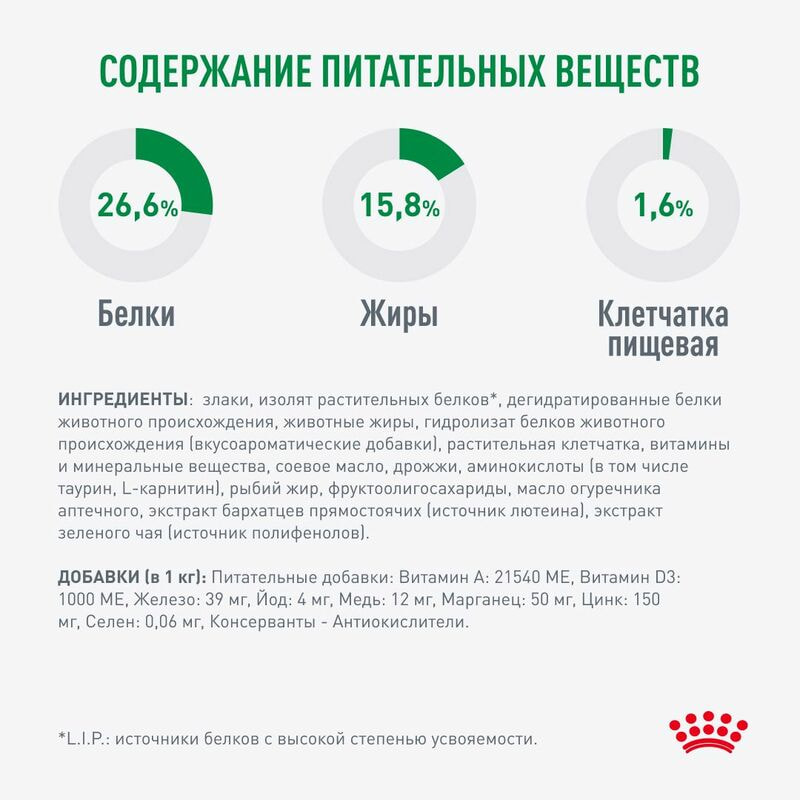 Благодаря оптимальной формуле со специальными ароматами, форме и размеру гранул, ROYAL CANIN® Mini Adult 8+ (МИНИ ЭДАЛТ 8+) отличается высокой вкусовой привлекательностью, удовлетворяя предпочтения даже привередливых в питании собак, часто встречающихся среди представителей мелких пород.