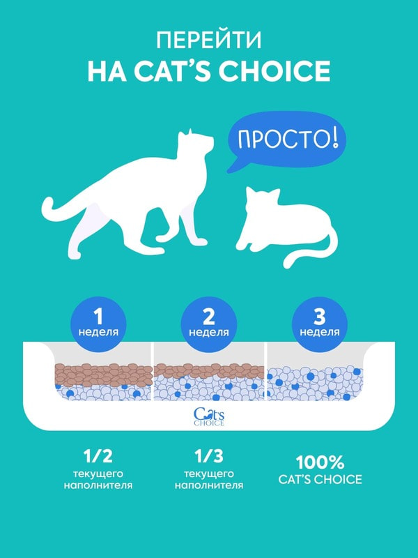 Силикагелевый впитывающий наполнитель Cat’s choice моментально впитывает влагу и блокирует неприятный запах благодаря