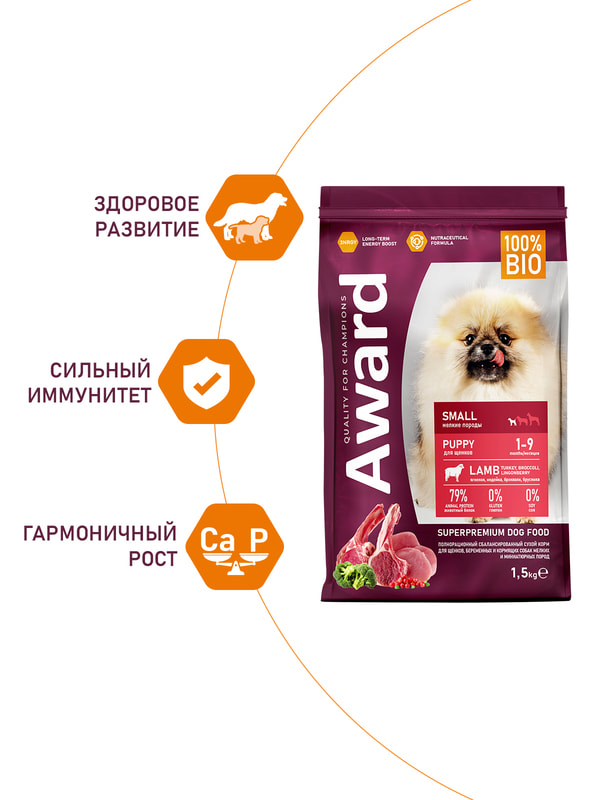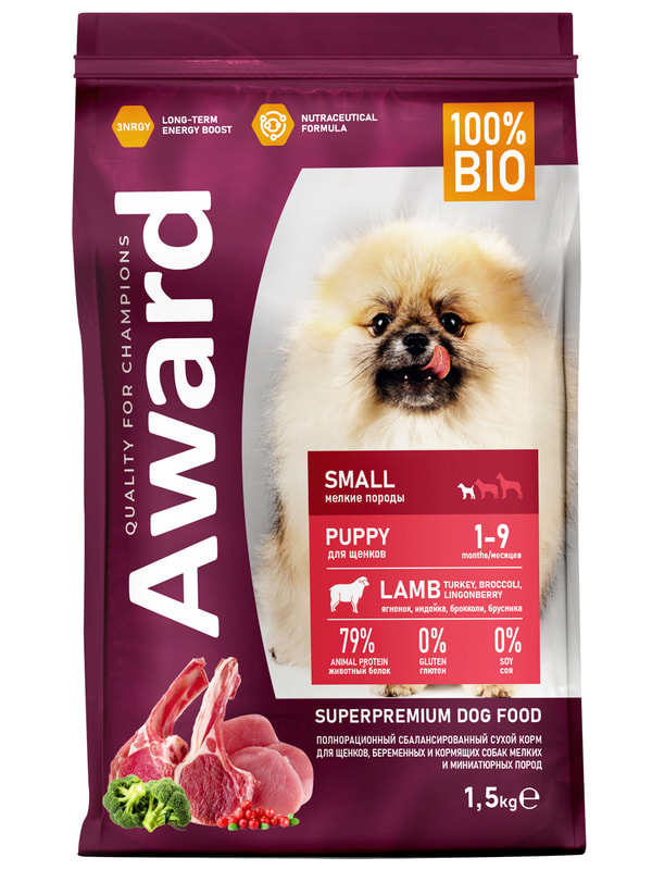 Повседневные корма Award Сухой корм AWARD для щенков от 1 мес, беременных и кормящих сук мелких и мин. пород с ягненком и индейкой с добавлением брокколи и брусники 1,5кг