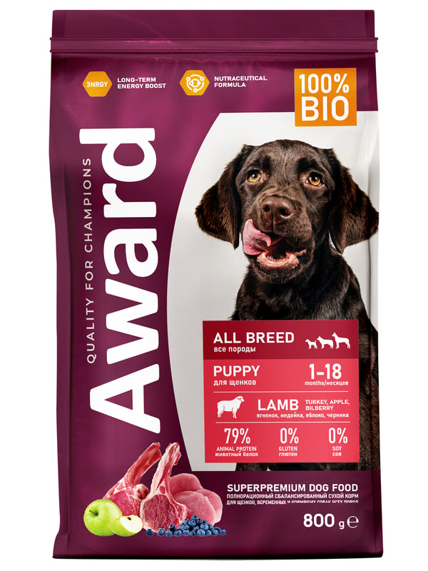 Сухой корм AWARD для щенков от 1 месяца, беременных и кормящих сук всех пород с ягненком и индейкой с добавлением яблока и черники 800 г.