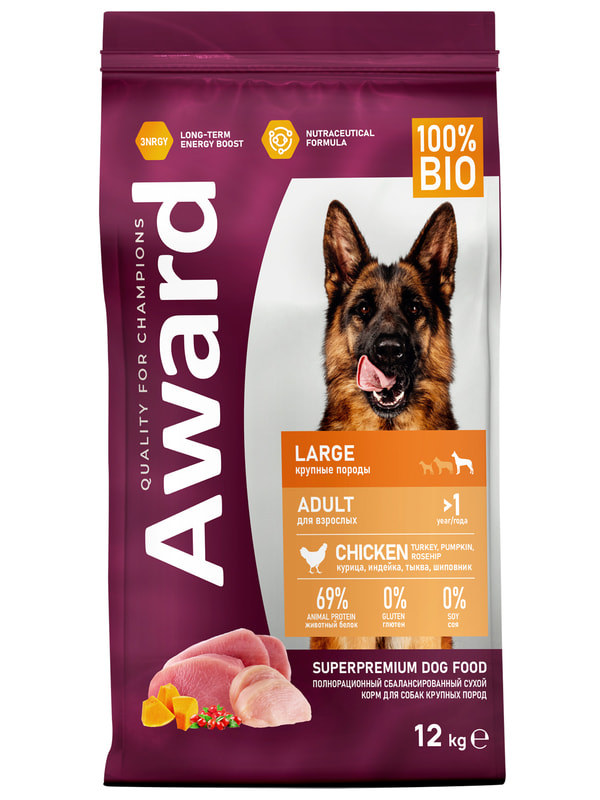Сухой корм AWARD для взрослых собак крупных пород с курицей и индейкой с добавлением тыквы и шиповника 12 кг.