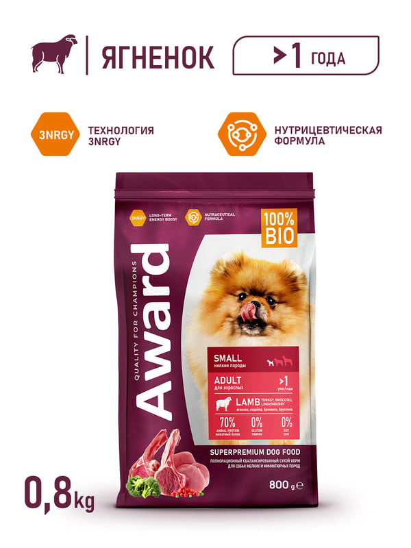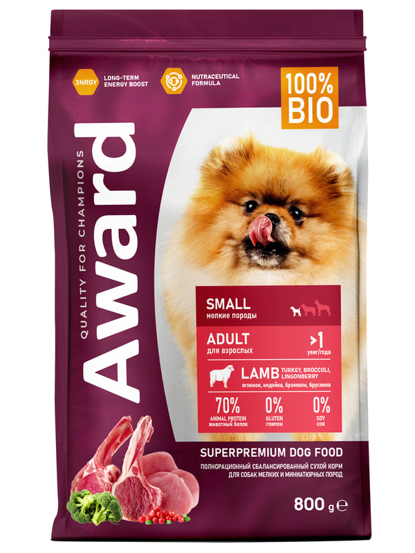Сухой корм AWARD для взрослых собак мелких и миниатюрных пород с ягненком и индейкой с добавлением брокколи и брусники 800 г.