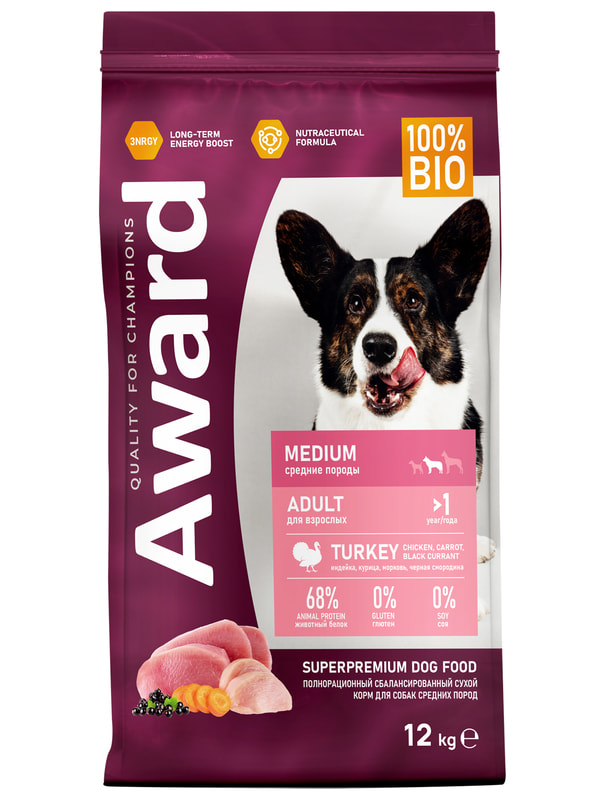 Повседневные корма Award Сухой корм AWARD для взрослых собак средних пород с индейкой и курицей с добавлением моркови и черной смородины 12кг