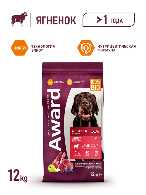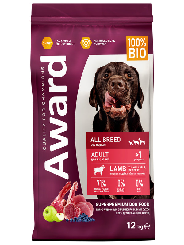 Сухой корм AWARD для взрослых собак всех пород с ягненком с индейкой с добавлением яблока и черники 12 кг.