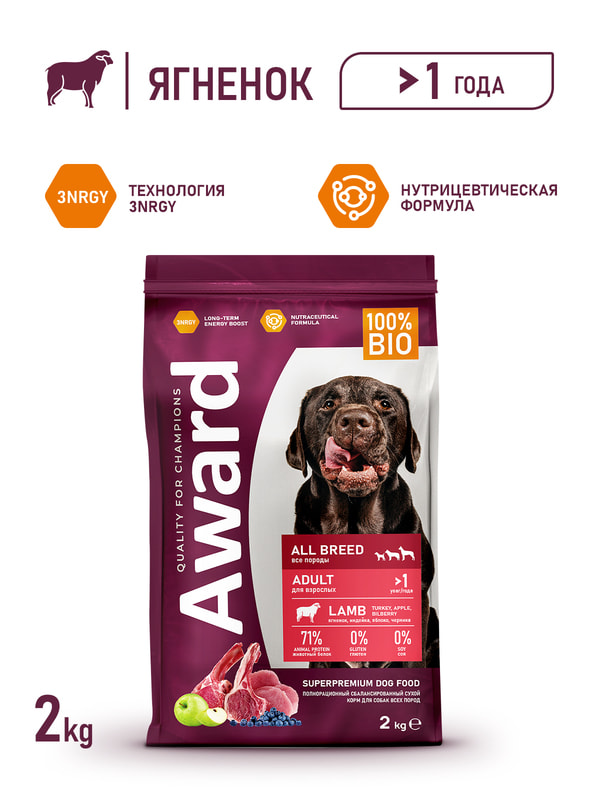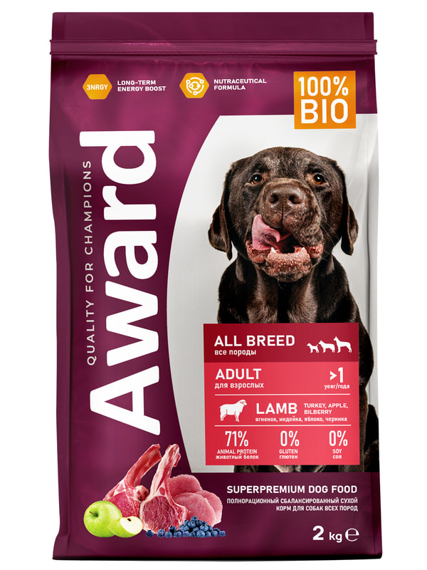 Сухой корм AWARD для взрослых собак всех пород с ягненком с индейкой с добавлением яблока и черники 2 кг.