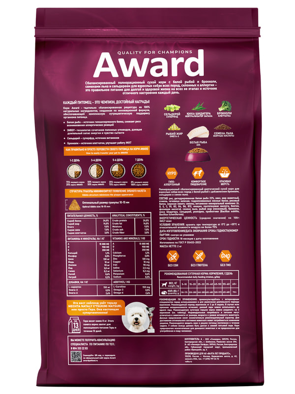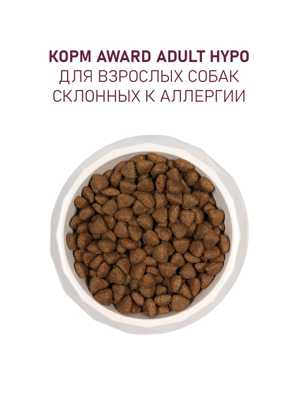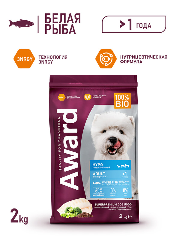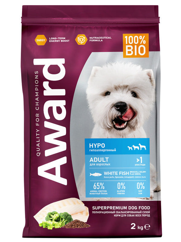 Сухой корм AWARD HYPO для взрослых собак всех пород с белой рыбой с добавлением брокколи, сельдерея и семян льна 2 кг.