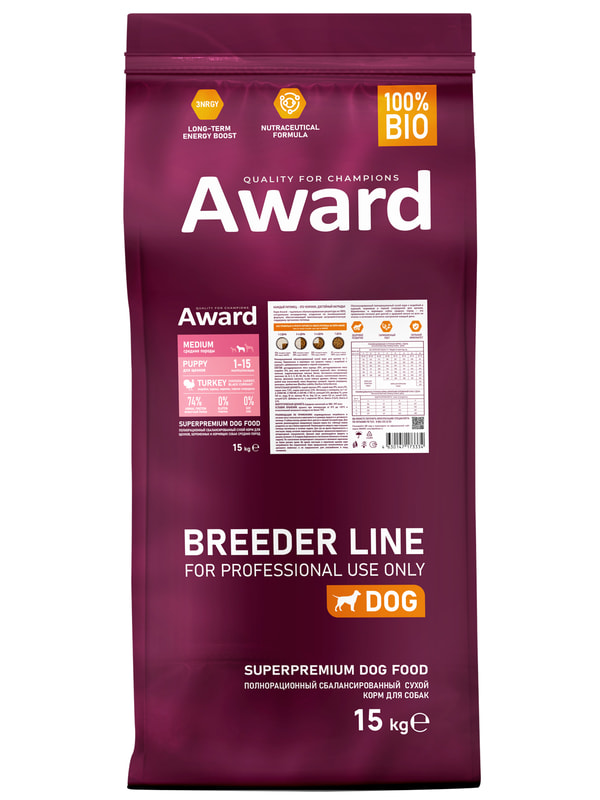 Сухой корм AWARD PFB для щенков от 1 мес, беременных и кормящих сук средних пород с индейкой и курицей с добавлением моркови и черной смородины 15 кг.