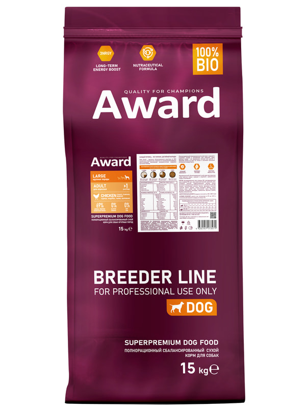 Сухой корм AWARD PFB для взрослых собак крупных пород с курицей и индейкой с добавлением тыквы и шиповника 15 кг.