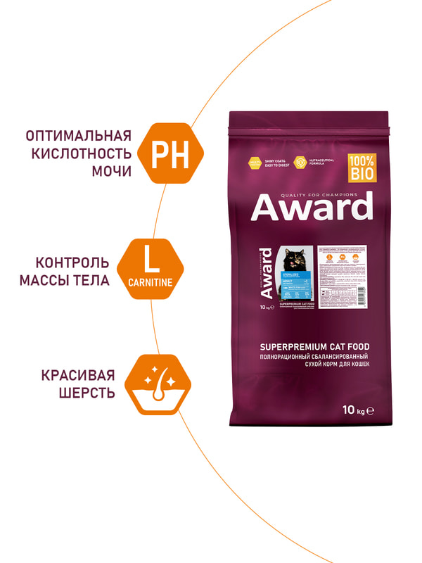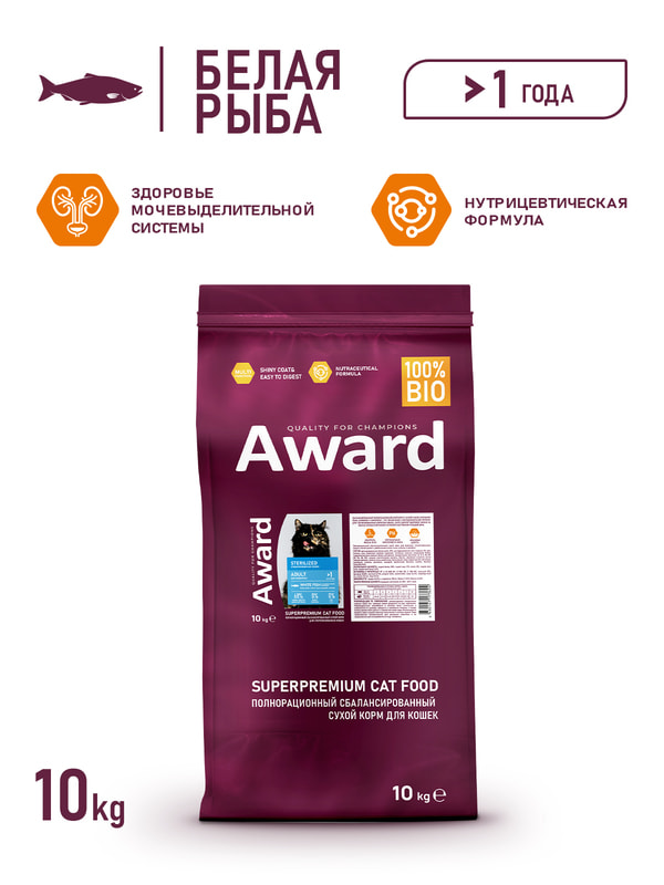 Повседневные корма Award Сухой корм AWARD Sterilized для взрослых стерилизованных кошек с белой рыбой с добавлением семян льна, клюквы и цикория 10кг