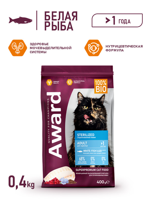 Сухой корм AWARD Sterilized для взрослых стерилизованных кошек с белой рыбой с добавлением семян льна, клюквы и цикория 400 г.