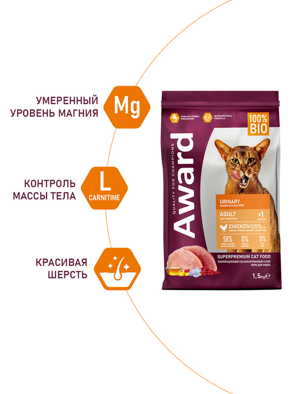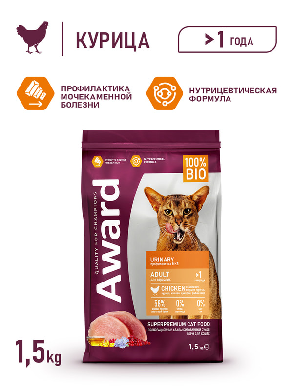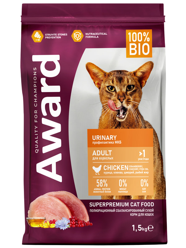 Сухой корм AWARD Urinary для взрослых кошек для профилактики мочекаменной болезни с курицей с добавлением клюквы, цикория и рыбьего жира 1,5 кг.