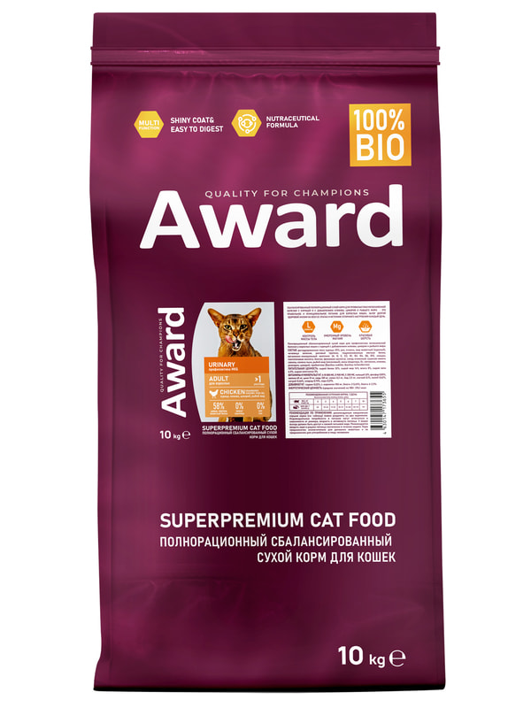 Сухой корм AWARD Urinary для взрослых кошек для профилактики мочекаменной болезни с курицей с добавлением клюквы, цикория и рыбьего жира 10 кг.