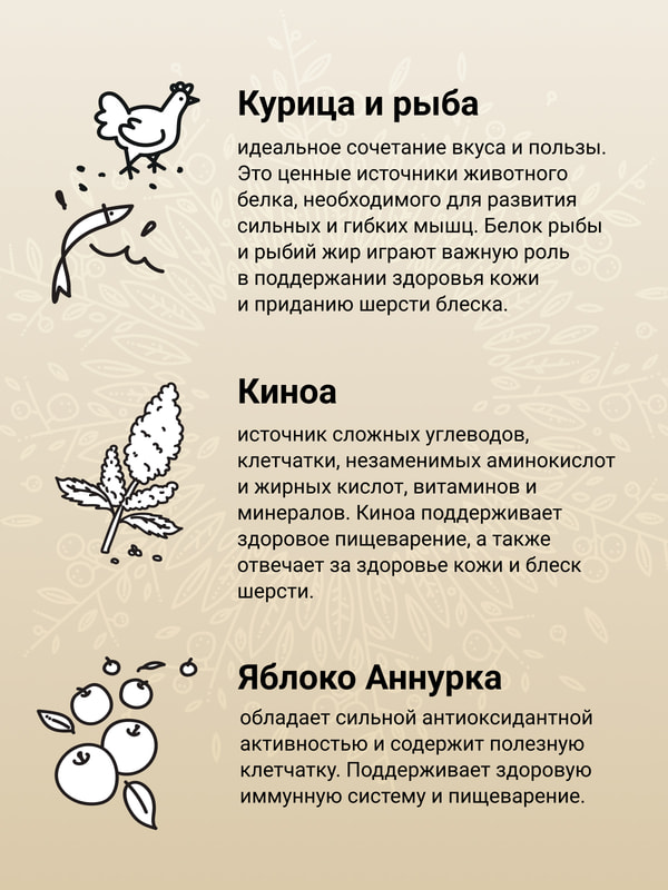 Основные источники белка в корме — свежее мясо курицы, сельдь и лосось. Разнообразные источники животных белков обеспечивают оптимальный аминокислотный состав и набор питательных компонентов. Лосось и сельдь богаты незаменимыми Омега-3 жирными кислотами и минеральными веществами. Жирные кислоты контролируют воспалительные процессы в организме, что хорошо влияет на здоровье суставов. Легкоусвояемый рыбный белок способствует формированию крепкой мускулатуры, улучшает состояние кожи.