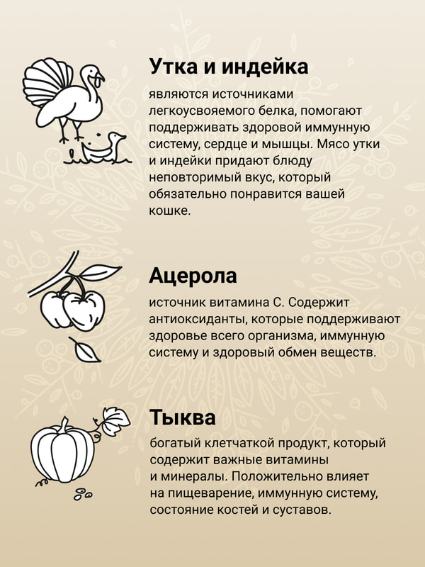 Основные источники белка в корме — свежее мясо утки и индейки. Комбинация этих белков легко переваривается, помогает поддерживать оптимальный вес питомца, стабилизирует обмен веществ.