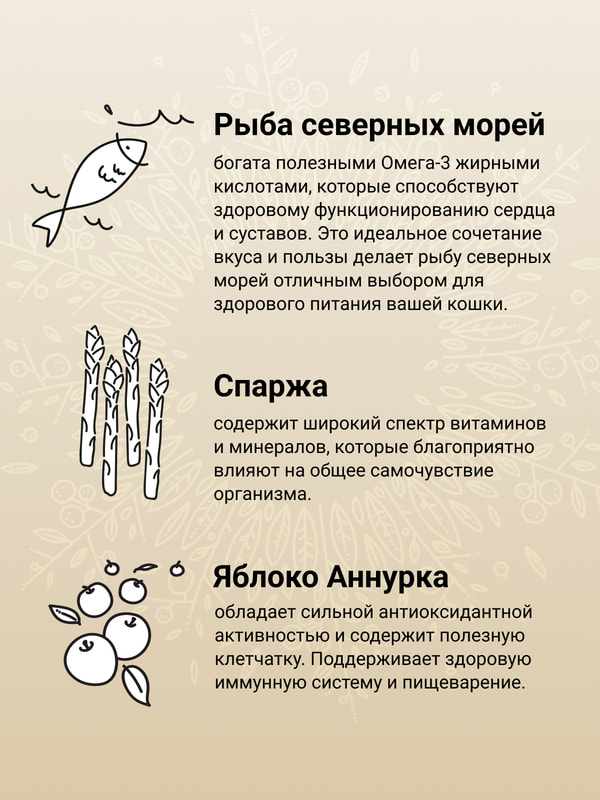 Ингредиенты: лосось (20%), сельдь (16%), гороховый крахмал, дегидратированный белок лосося (10%), дегидратированный белок сельди (10%), рыбий жир (лососевый), гидролизованный рыбий белок (треска, пикша), куриный жир, киноа (4%), льняное семя, сухая свекольная пульпа, люцерновая мука, волокна гороха, сушеная спаржа (0,5%), сушеное яблоко Аннурка (0,5%), сушеная черника, сушеная клюква, сушеная ацерола, сушеная тыква, инулин цикория (0,4%), дрожжевой экстракт (источник маннанолигосахаридов) (0,3%), фруктоолигосахариды (0,3%), аскофиллум узловатый (Ascophyllum Nodosum), карбонат кальция, монокальцийфосфат, хлорид калия, хлорид натрия, сухие пивные дрожжи, алоэ вера, розмарин, куркума, календула, семена и шелуха подорожника, юкка Шидигера. Из-за технологических особенностей производства продукт может содержать в незначительных количествах следы белков растительного и животного происхождения (курицы, индейки, говядины, ягненка, кролика, утки, свинины, рыбы), используемых на заводе в других рецептурах.