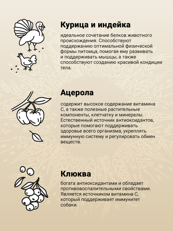 Основные источники белка в корме — свежее мясо курицы и индейки. Комбинация этих белков легко переваривается, помогает поддерживать оптимальный вес питомца, стабилизирует обмен веществ. Курица и индейка — отличные источники незаменимых аминокислот, витаминов и минералов.
