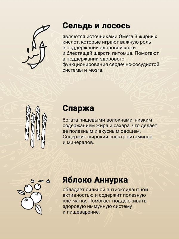 Основные источники белка в корме — лосось и сельдь. Они богаты незаменимыми Омега-3 жирными кислотами и минеральными веществами. Жирные кислоты контролируют воспалительные процессы в организме, что хорошо влияет на здоровье суставов. Легкоусвояемый рыбный белок способствует формированию крепкой мускулатуры, улучшает состояние кожи.