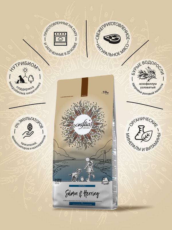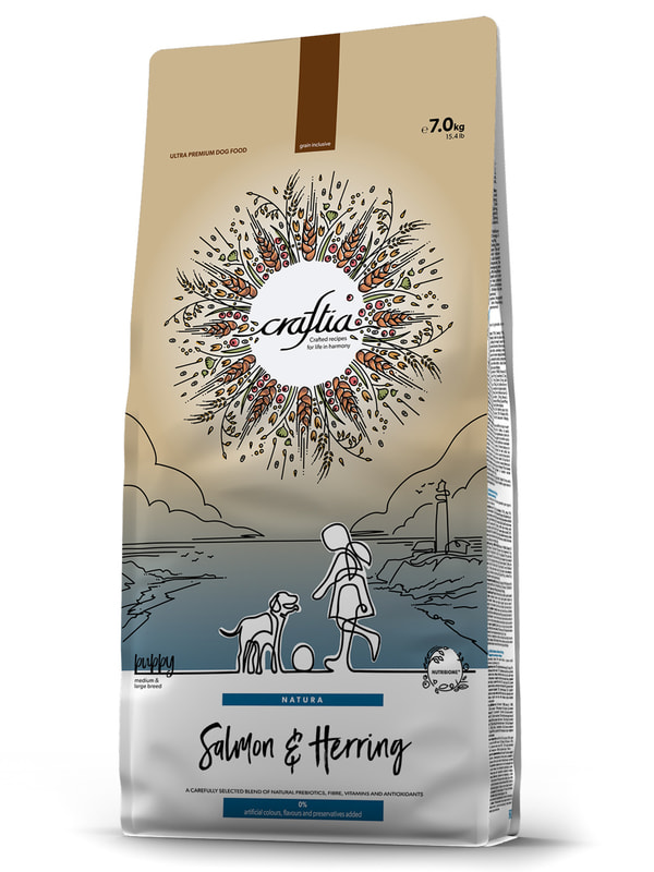 CRAFTIA NATURA сухой корм для щенков средних и крупных пород из лосося и сельди.