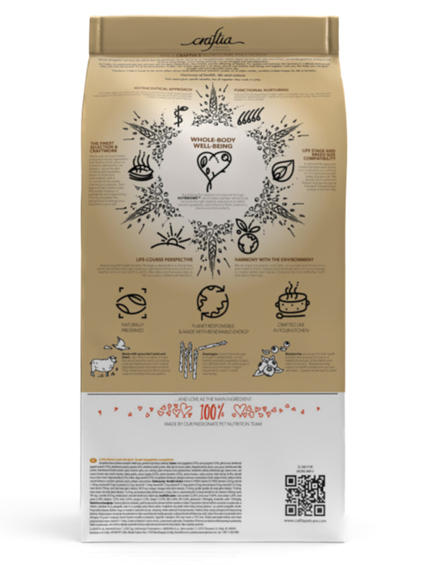 Состав кормов CRAFTIA прозрачен и понятен, отсутствуют скрытые добавки и сомнительные ингредиенты. Все, что заявлено в составе корма, гарантированно присутствует в каждой грануле. Собственный завод, сотни квадратных метров научно-исследовательских лабораторий, первоклассное сырье — все это позволяет создавать тщательно сбалансированный высокобелковый корм с холистическим подходом. Все компоненты корма подходят для употребления человеком и не содержат ГМО.
