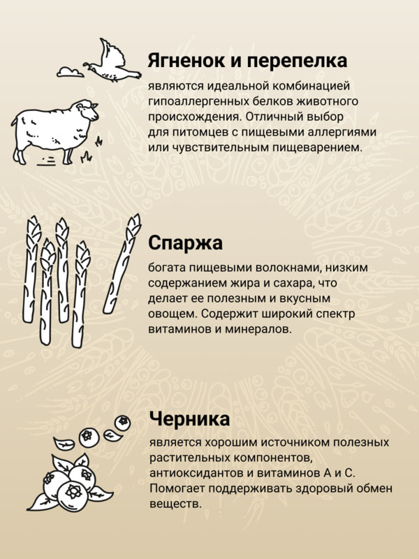 Основные источники белка в корме — свежее мясо ягненка и перепелки. Это редко встречающиеся ингредиенты, поэтому они подходят животным, склонным к возникновению аллергических реакций. Ягненок и перепелка — отличные источники незаменимых аминокислот, витаминов и минералов. Они легко усваиваются, помогают поддерживать оптимальный вес питомца, стабилизируют обмен веществ.