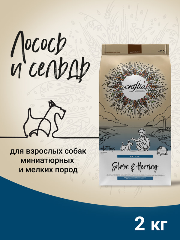 Повседневные корма Craftia Сухой корм CRAFTIA NATURA для взрослых собак миниатюрных и мелких пород из лосося с сельдью 2 кг