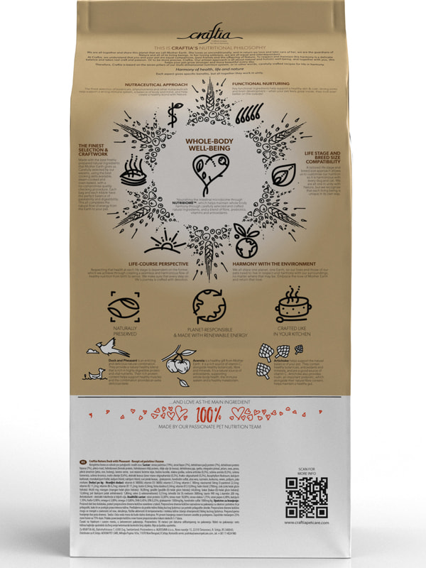Состав кормов CRAFTIA прозрачен и понятен, отсутствуют скрытые добавки и сомнительные ингредиенты. Все, что заявлено в составе корма, гарантированно присутствует в каждой грануле. Собственный завод, сотни квадратных метров научно-исследовательских лабораторий, первоклассное сырье — все это позволяет создавать тщательно сбалансированный высокобелковый корм с холистическим подходом. Все компоненты корма подходят для употребления человеком и не содержат ГМО.