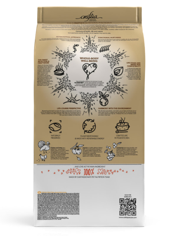 Состав кормов CRAFTIA прозрачен и понятен, отсутствуют скрытые добавки и сомнительные ингредиенты. Все, что заявлено в составе корма, гарантированно присутствует в каждой грануле. Собственный завод, сотни квадратных метров научно-исследовательских лабораторий, первоклассное сырье — все это позволяет создавать тщательно сбалансированный высокобелковый корм с холистическим подходом. Все компоненты корма подходят для употребления человеком и не содержат ГМО.