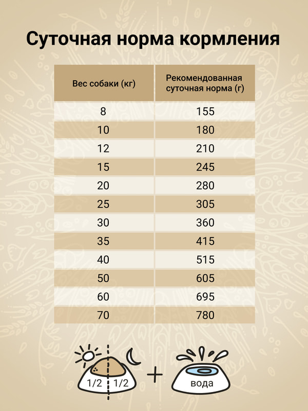 Источники углеводов — спельта, бурый рис, ячмень, овес и просо. Специально подобраны злаки с разным гликемическим индексом, чтобы питомец дольше чувствовал себя сытым: глюкоза поступает в организм постепенно, а значит, чувство голода не наступает дольше.